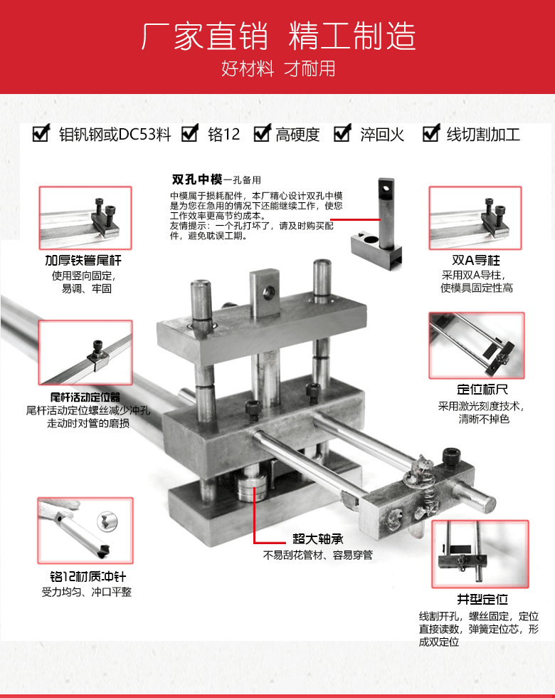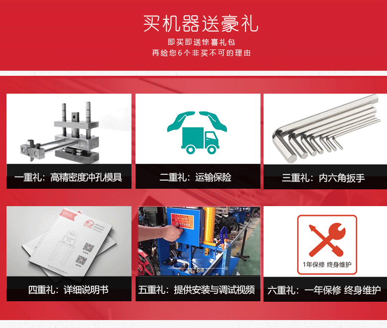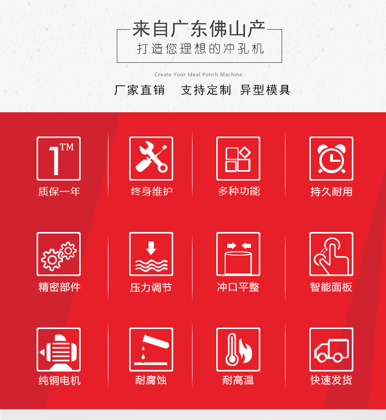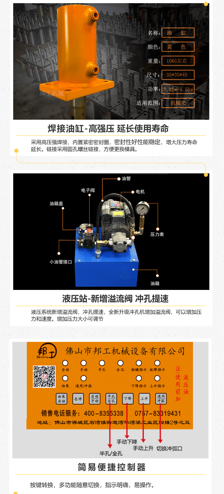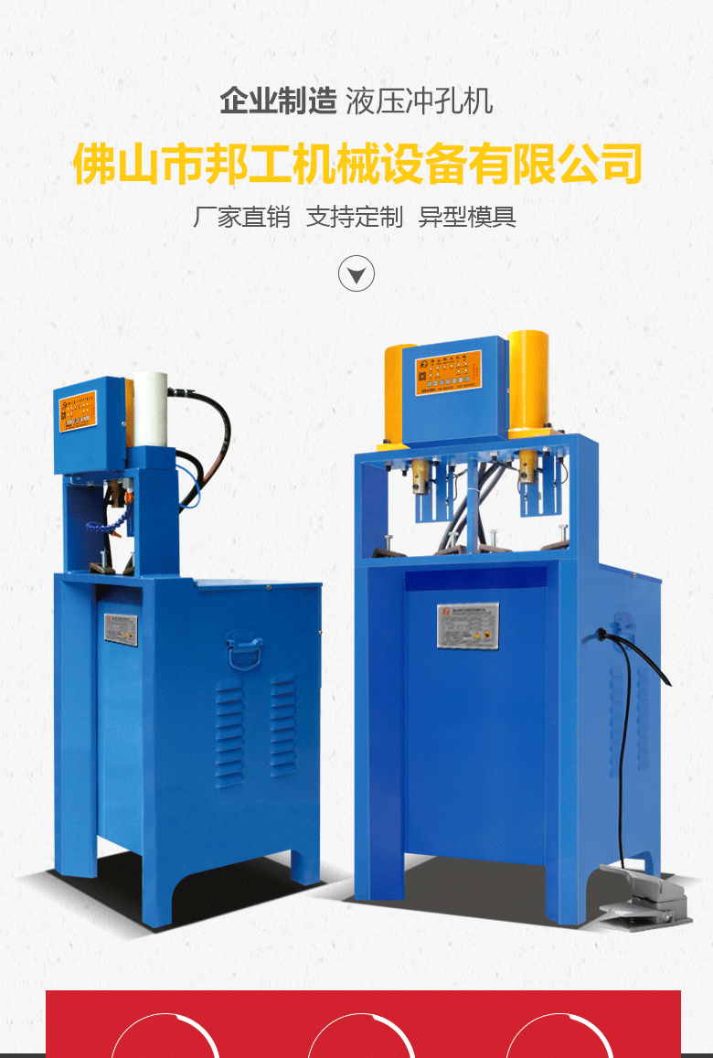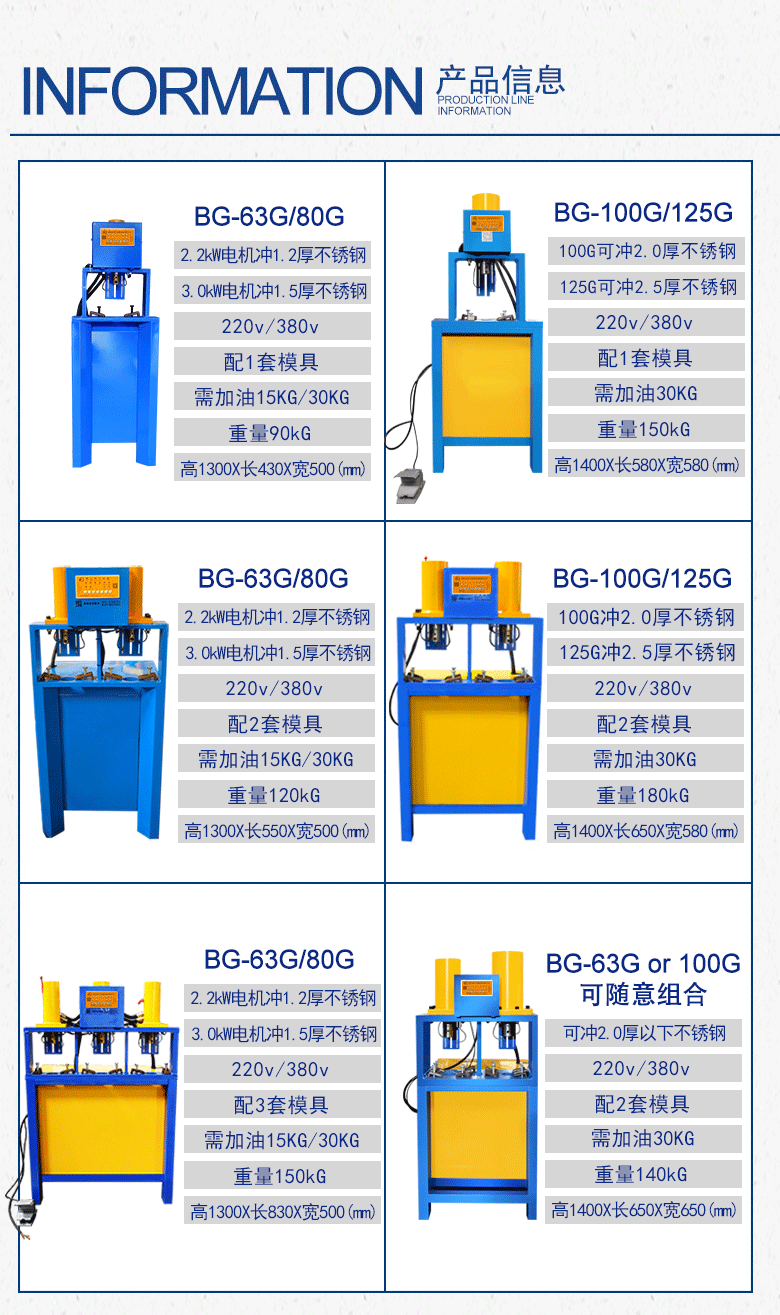 品牌:邦工 产品名称:液压冲孔机 型号:BG-ckJ-80G 加工厚度:1.5个厚以内 机身:450*450*1300mm 重量:120kg 用途:冲孔、断料、冲压 作用对象:不锈钢管、铁管、PVC管、铝管、板材等 作业原理:液压 电机:2.2kw、3.0kw、4kw、5.5kw、7.5kw 以上所有参数仅供参考,机器重量,外形尺寸等请来电咨询详细资料。