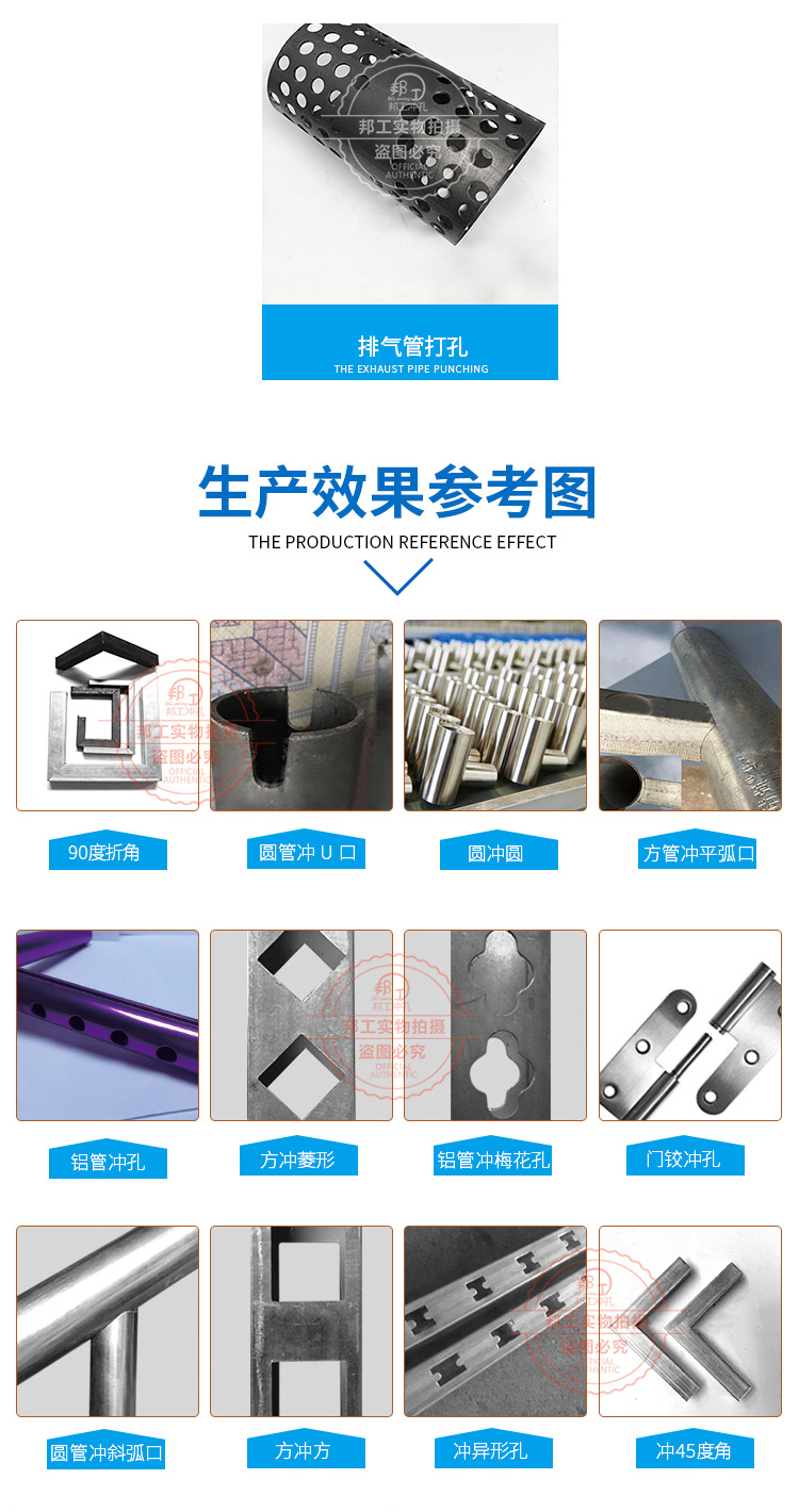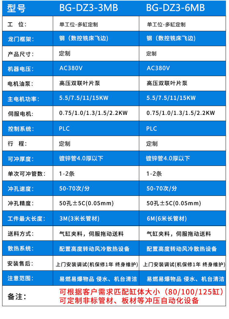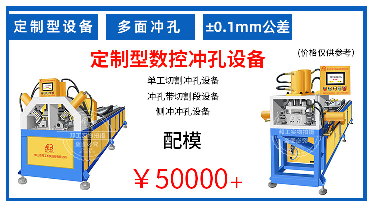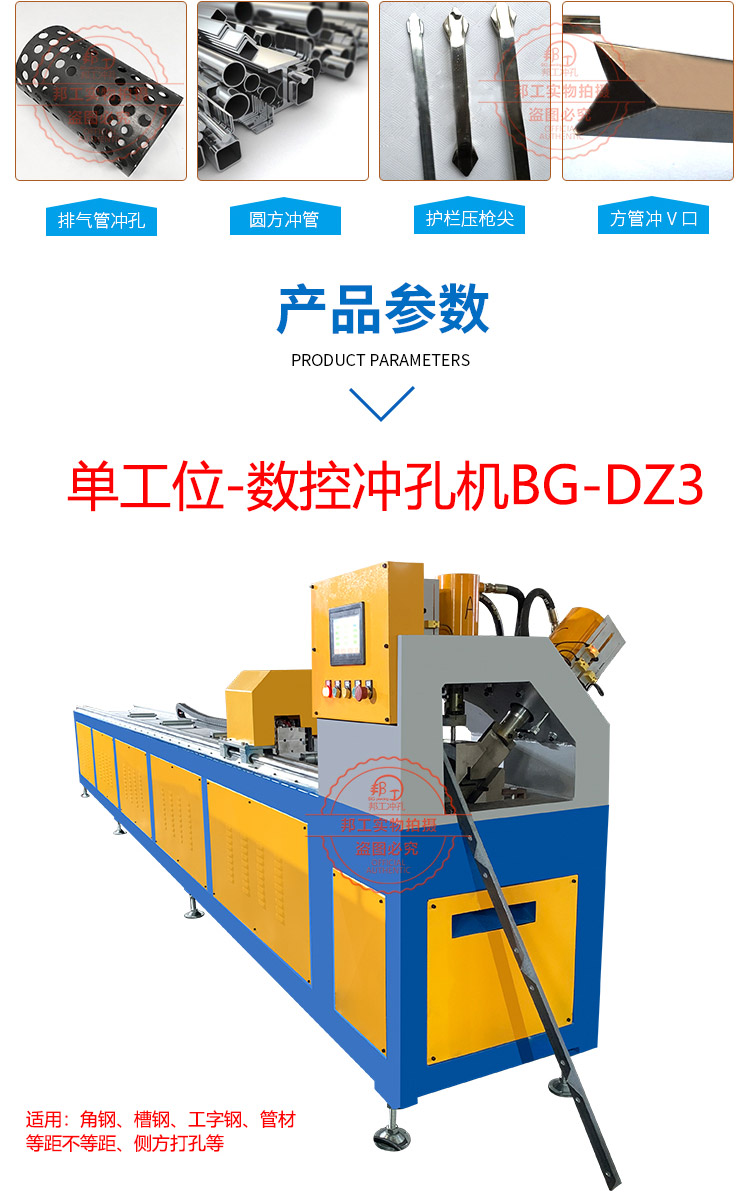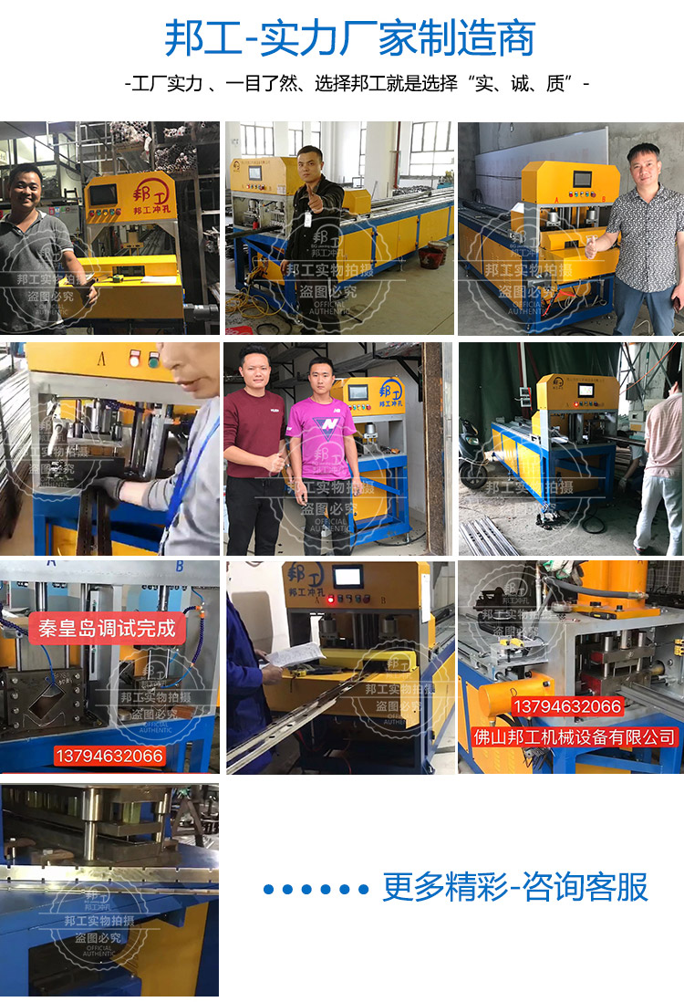 品牌:邦工 产品名称:单线角钢方管爬架冲孔断料一体机 型号:BG-JG-3*125G 加工厚度:5个厚以内 机身:6.7米(可定制) 重量:1.8吨 用途:冲压、断料 作用对象:槽钢、方管、角钢 动力形式:自动化 作业原理:液压数控 电机:5.5kw\7.5KW\11kw\ 15kw 以上所有参数仅供参考,机器重量,外形尺寸等请来电咨询详细资料。