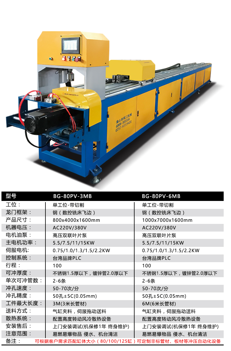 品牌:邦工 产品名称:不锈钢数控冲孔切断一体机 型号:BG-ck-2*80G 加工厚度:1.5个厚以内 机身:6.7(可定制) 重量:1.5吨 用途:冲孔、断料 作用对象:不锈钢管、铁管、PVC管、铝管等 动力形式:自动化 作业原理:液压数控 断料方式:高速锯切 电机:4kw、5.5kw、7.5KW 以上所有参数仅供参考,机器重量,外形尺寸等请来电咨询详细资料。